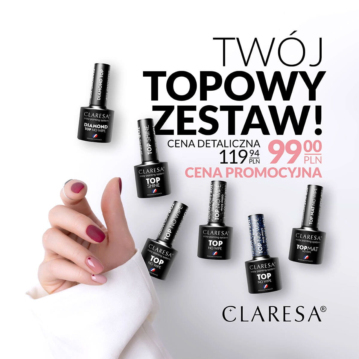 • Claresa Top No Wipe - jeśli chcesz, aby zakończenie stylizacji odbyło się bez Cleanera,